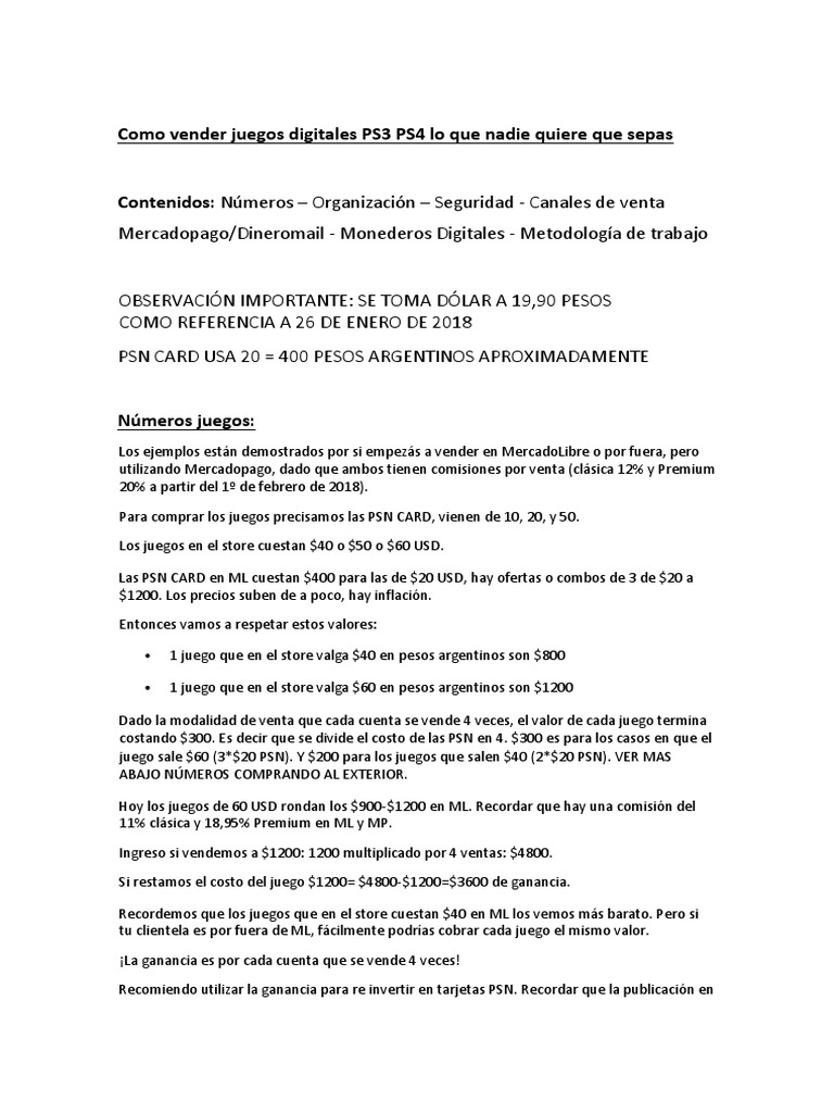 Lo que recibes con tu compra 2 dos archivos de lectura para venta de juegos de PS3 y PS4 Videos explicativos del procedimiento AHORA con explicativos para TUS CLIENTES Respondo tus dudas-. Puede ver el proceso que debe seguir en el vídeo que tenemos en la pagina. El proveedor vende juegos digitales 1 solo o puede vender en packs es decir muchos juegos voy a dejar unos precios a lo que los vende el proveedor TODAS LAS CUENTA QUE VENDE SON PRIMARIAS ES DECIR PODES JUGAR EN CUALQUIER USUARIO.